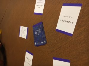 4人でたくさんのカードを囲み、その中から、それぞれが大事と思うカードを5枚を選び出し、最終的に2枚に絞ります。